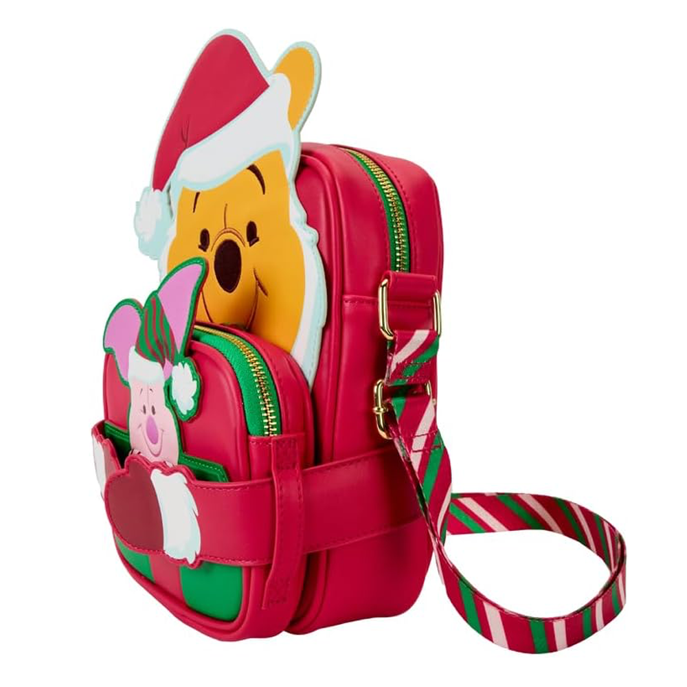 Embrace the holiday spirit with the whimsical charm of the Loungefly Winnie The Pooh Santa Pooh & Piglet Cross buddies Bag! This delightful accessory features Winnie the Pooh in a Santa hat and beard, lovingly clutching a detachable, reversible coin purse. One side showcases Disney’s Piglet, while the other reveals a gorgeously wrapped honey pot gift. With candy-cane striped adjustable straps and gold-colored hardware, this bag is perfect for fans wanting to add a sprinkle of festive magic to their wardrobe. Whether carrying honey or holiday treasures, this bag is a must-have for any Pooh enthusiast!
