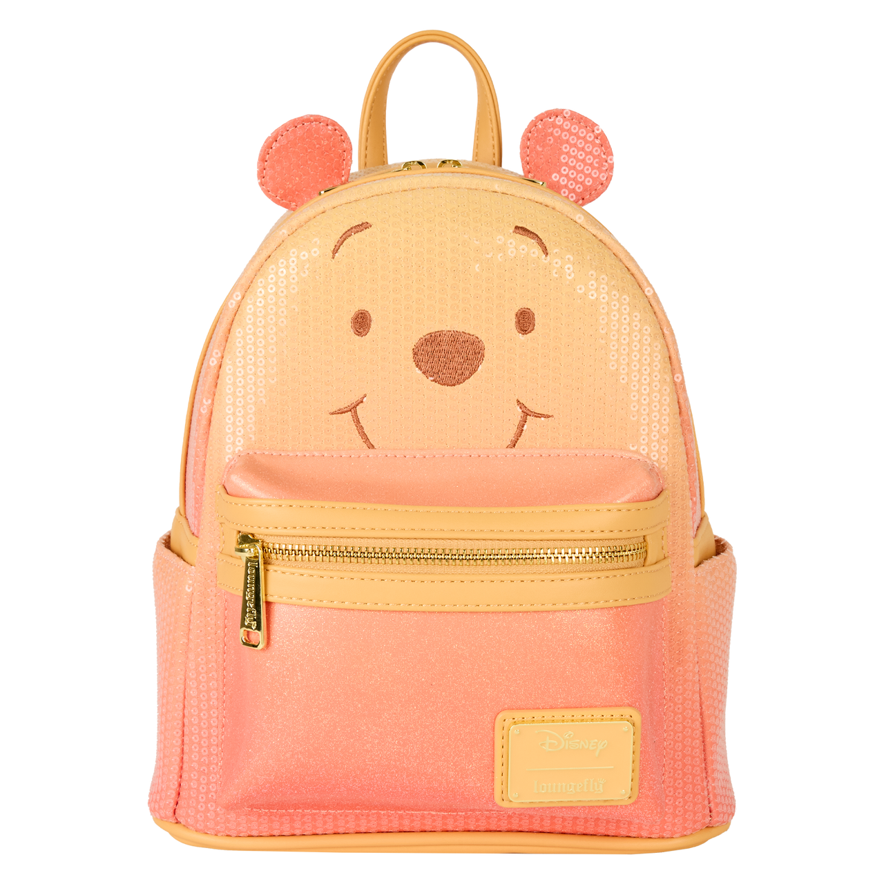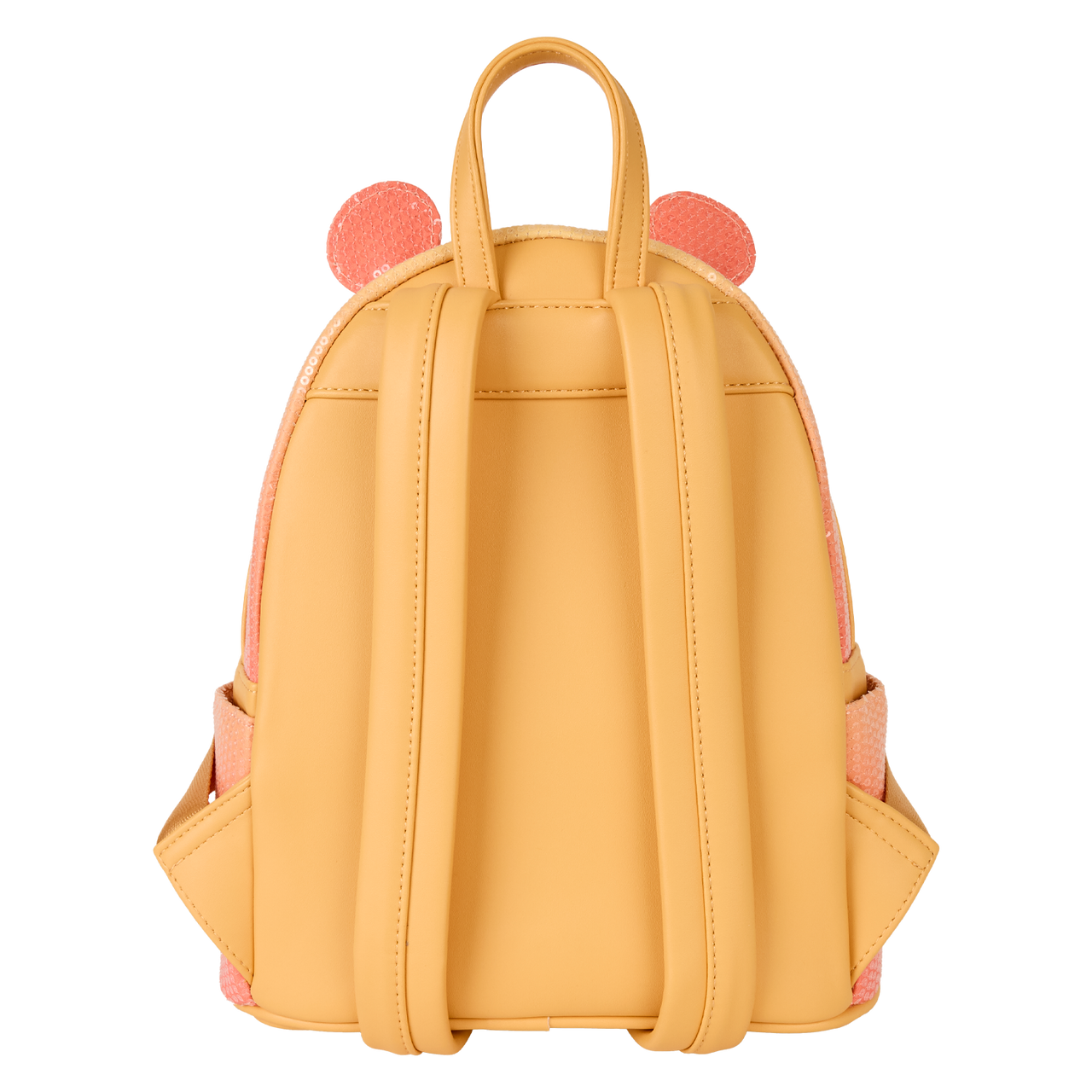 This mini backpack features Winnie the Pooh with embroidered facial details on the front and 3D applique ears. The bag is covered in sequins and the front pocket shines with glitter details. The colours transition from yellow to pink for an ombre effect!