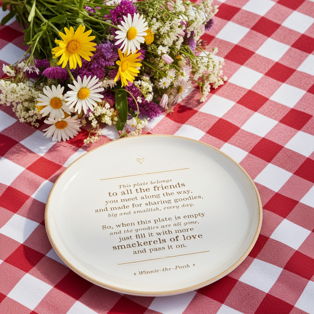 Quote reads "This plate belongs to all the friend you meet alog the way, and made for sharing goodies, big and smallish, everyday. So, when this plate is empty, and the goodies are all gone, just fill it with more smackerels of love and pass is on."