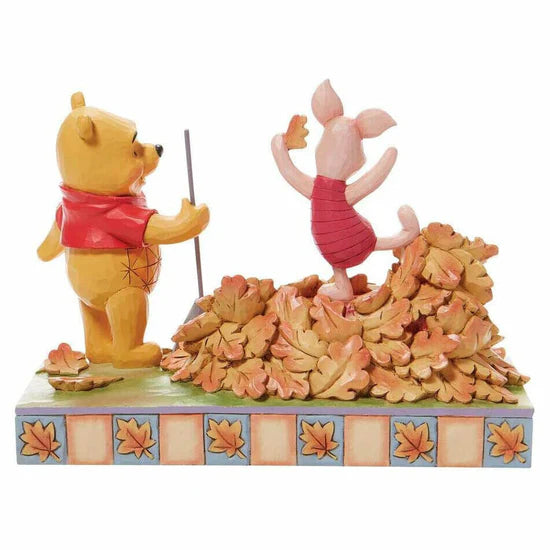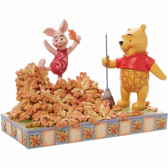 Pooh Bear and Piglet enjoy a fall day in this well crafted statuette by Jim Shore. Winnie the Pooh rakes a yard-full of leaves into a giant pile while Piglet prepares to leap into it. A smile on his face, Pooh doesn't mind the extra clean up. Winnie the Pooh 95th Anniversary 2021.