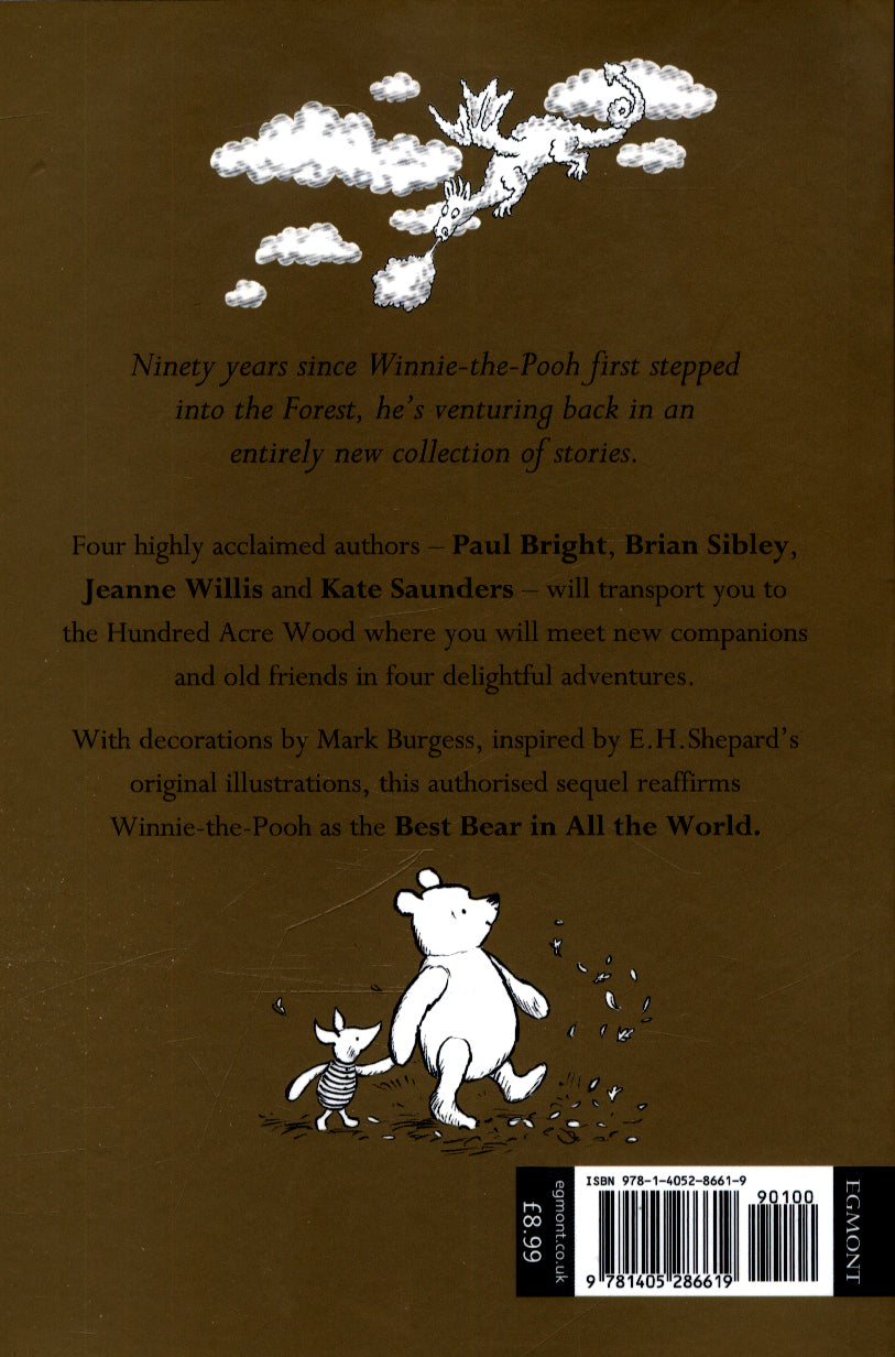With brand-new stories from some of the most beloved children's authors writing today: Paul Bright, Brian Sibley, Kate Saunders and Jeanne Willis – each will transport you back into the Hundred Acre Wood for more adventures with Winnie-the-Pooh, Christopher Robin, Piglet, Tigger, Eeyore and the rest of the gang. With decorations by Mark Burgess, in the style of the cherished illustrations by E.H. Shepard.
