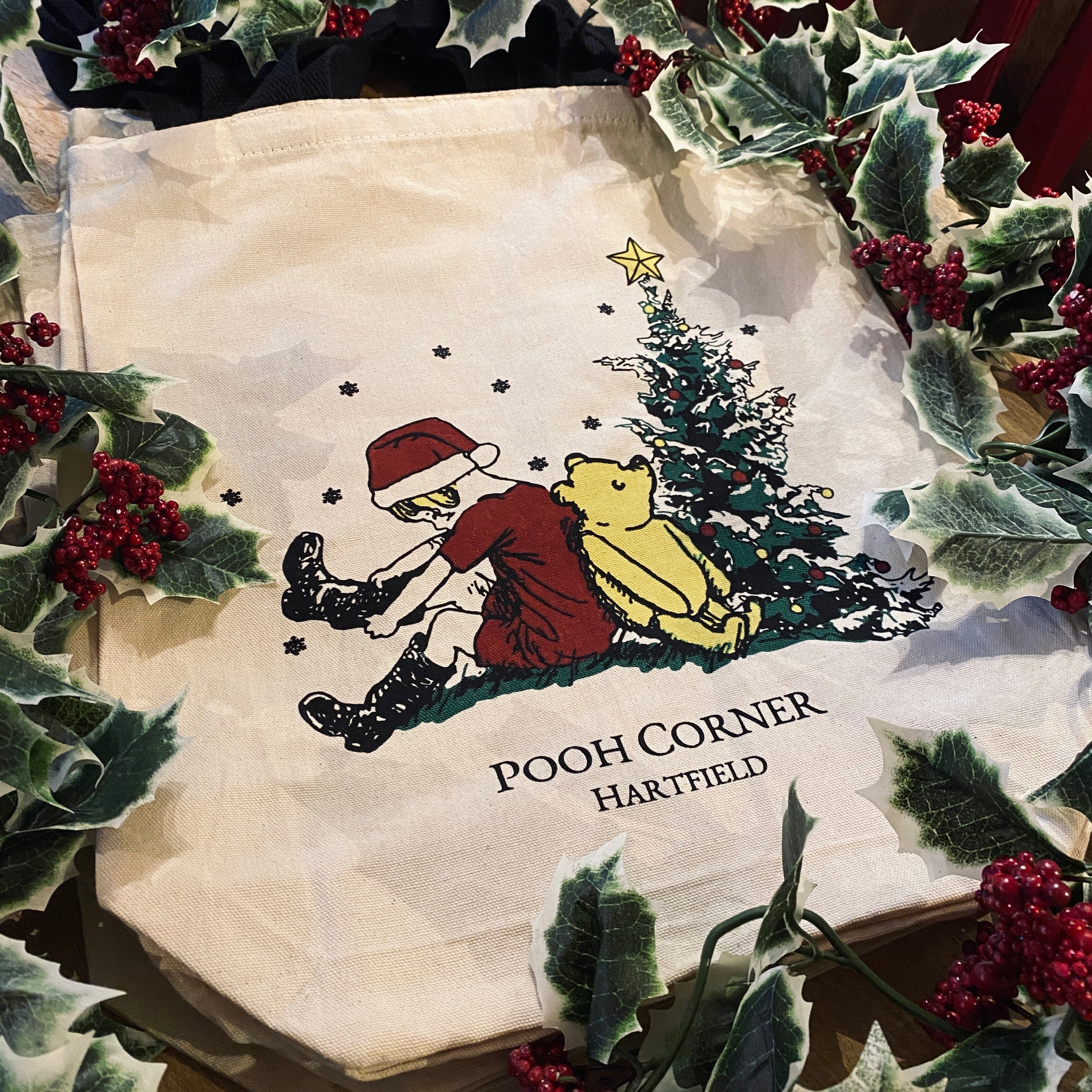 This Tote is sturdy with two black webbed handles and features Pooh Corner's famous 'Boy and Bear' Logo with a Christmas twist! This Christmas Logo Colour Tote Bag serves as a practical reusable bag for shopping, travel, work, or beach outings.